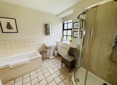 The bathroom includes both a bath and a walk-in shower with a luxury shower head.