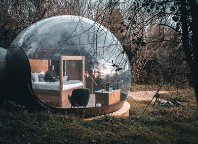 The Premium Forest Domes feature two bubbles combined affording ample space with a panoramic view of the forest and night sky. The bubble includes luxury bedroom and free standing stone bath overlooking the woodland, allowing you to truly immerse yourself in the beauty and tranquility of nature. Featuring a bespoke four poster bed, ensuite bathroom, free standing stone bath, Nespresso coffee machine, fluffy robes and daily breakfast.