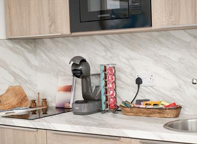 Fully Equipped Kitchen: Comes with a microwave, fridge, 2 ring induction hob, Coffee machine, sink, and cupboard stocked with all necessary cutlery, plates, and cups.