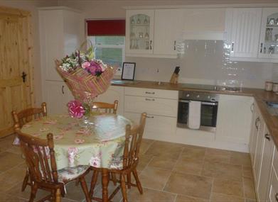 The ground floor comprises of an open plan kitchen and living area. The kitchen is fitted out with all the modern conveniences including washing machine, tumble dryer, dishwasher and electric cooker and hob and includes a dining area for eight people. The living room has three comfortable leather sofas, log burner with back boiler & 42” television & DVD player. A French door leads onto a patio area. The hallway and stairs to the upper floor are located within the old mill building. In this area the gearing mechanism for the mill remains intact and is on display as are other tools and items found during the renovation work. Off the hallway there is a twin bed room and bath room/wet area.