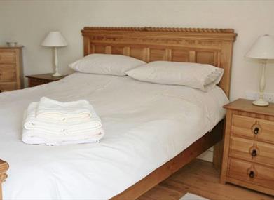Upstairs: two bedrooms; each with a double and a single bed, bathroom with shower over bath.