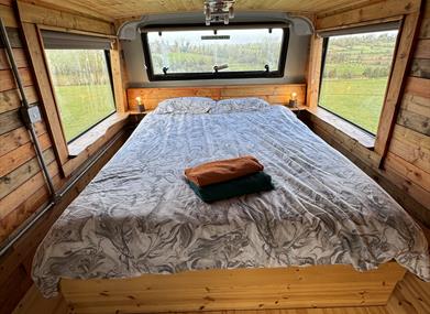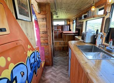 The Bus is fully insulated and heated and sleeps 6 persons in 4 bunk beds and a king sized bed. You also have a living/dining area. a kitchen with kettle, toaster. ,microwave and sink. there is a fully functioning bathromm, upper seating area and even a bbq protruding from bus in the form of a morris oxford car.
