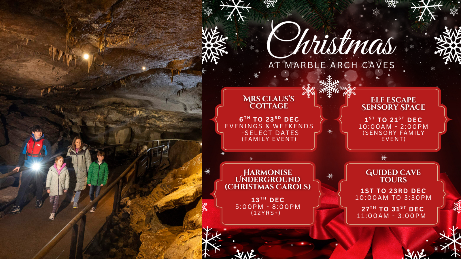 Step into a magical underground world - the perfect winter adventure for families and explorers alike, with Mrs Claus Cottage, Sensory Elf Escape and Harmonise Underground Christmas Carols there's a fabulous festive feel! Beneath the rolling hills of Fermanagh lies a hidden world – a maze of caves, sinkholes, and underground rivers. At the heart of it all are the Marble Arch Caves, the most active river cave in Ireland and the UK.