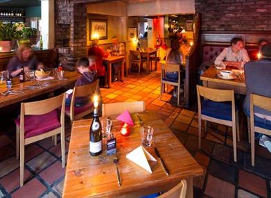 Specialities include mussels, crab, seafood, pasta, pizza, salads, chicken and steaks (wide choice).