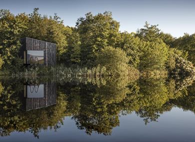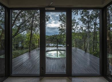 A stunning decked area that floats over the idyllic Lough Erne with expansive water views, surrounded by romantic reeds and foliage.