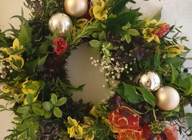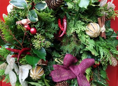 Decorate your front door and impress your friends and neighbours with a beautiful fresh foliage wreath for your front door. Your wreath will be made from a variety of fresh foliage cut from our garden and local hedgerows and decorated with a lovely array of dried fruits, pine cones and brightly coloured baubles and other delights to bring some festive cheer to your door.