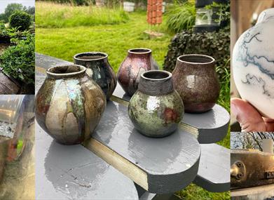 Our process commences with glazing and firing pottery from a selection of pre-made items, removing pottery from the kiln while at bright red heat and placing it into containers with combustible materials. This is a very exciting pottery experience that gives fast results and amazing effects.